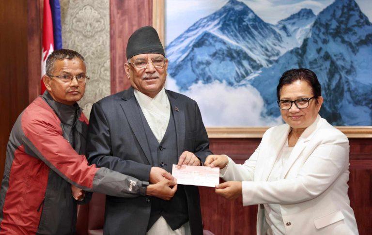मंगलबार माओवादी केन्द्रका उपाध्यक्ष पम्फा भुसाल, प्रमुख सचेतक हितराज पाण्डे, सचिव दीनानाथ शर्मा लगायतका नेताहरुले अध्यक्ष एवं प्रधानमन्त्री प्रचण्डले ५० लाखको चेक हस्तान्तरण गरेका हुन् ।