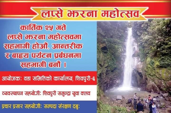 ‘आन्तरिक र बाह्य पर्यटनमा सहभागी बनौँ’ भन्ने नाराका साथ काग तिहारका दिन शिवपुरी वडा समितिको कार्यालय–६ को आयोजना र शिवपुरी समुन्द्रा युवा क्लबको व्यवस्थापन सहयोगमा ‘लप्से झरना महोत्सव’ गर्न लागिएको हो ।