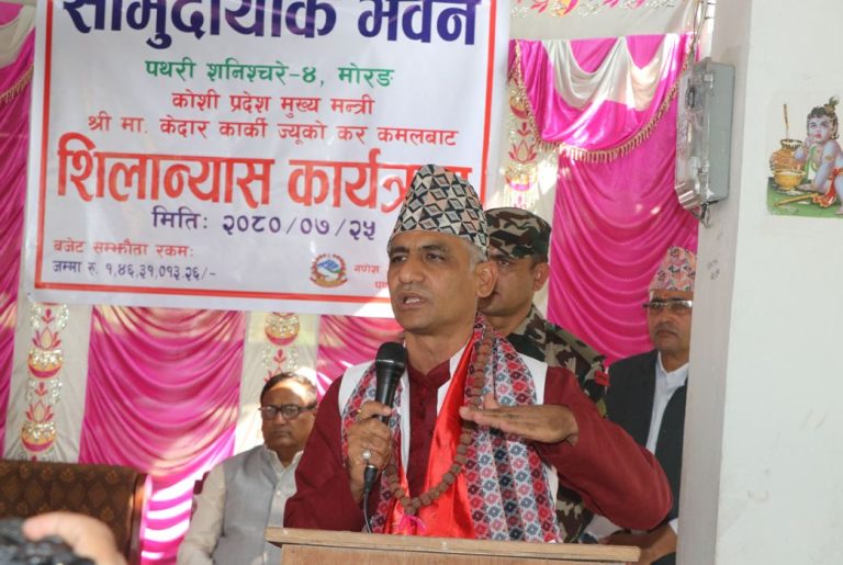 मोरङको पथरी शनिश्चरे- ४ स्थित गणेश अम्बिका प्रतिष्ठानको सामुदायिक भवन शनिबार शिलान्यास गर्दै उनले प्रदेश सरकारले ठूला विकासका आयोजनामा मात्र ध्यान दिने बताए।