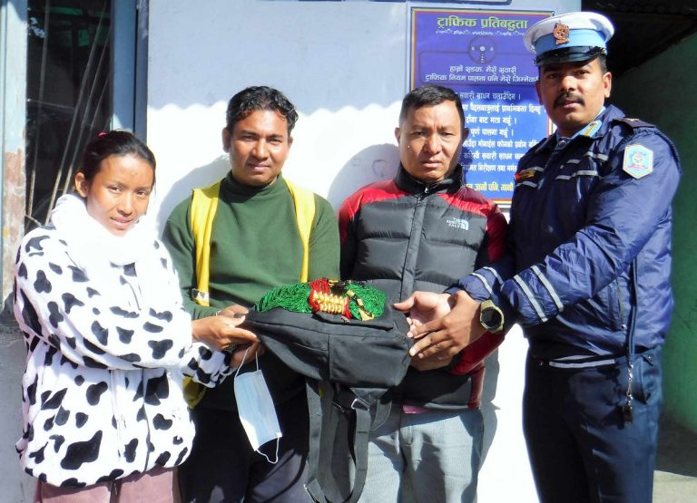 ट्याक्सीमा छुटेका सुनचाँदीका गरगहना सहितको झोला खोजी गरी काठमाडौं उपत्यका ट्राफिक प्रहरी कार्यालयको खोजतलास शाखाका प्रहरी निरीक्षक विशाल सिंहले आज धनीलाई हस्तान्तरण गरेका हुन्।