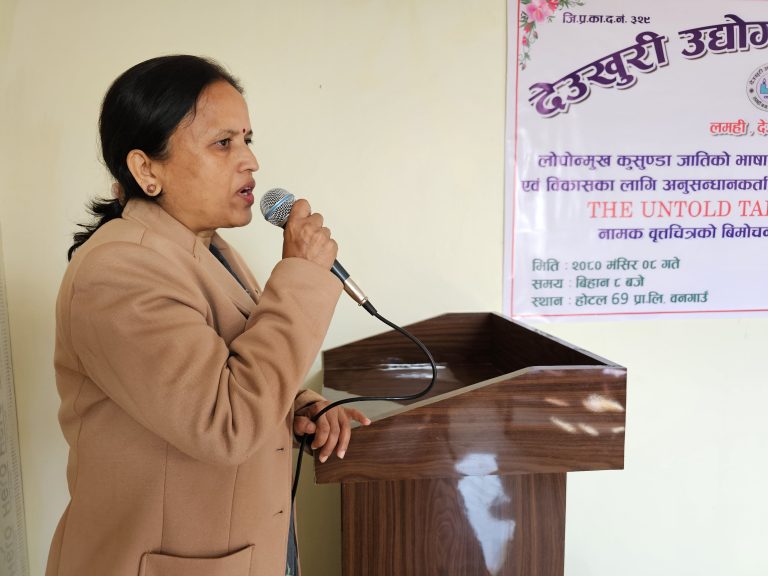अनुसन्धानकर्ता उदयराज आलेद्वारा तयार गरिएको वृत चित्रको आज बिमोचन गर्दै सरकारका प्रवक्ता एवं मन्त्री शर्माले कुसुन्डा भाषाको संरक्षणमा सरकारले सहयोग गर्ने प्रतिबद्धता व्यक्त गर्दै सबैको हातेमालाबाट संरक्षणमा बल पुग्ने विश्वास व्यक्त गरिन् ।