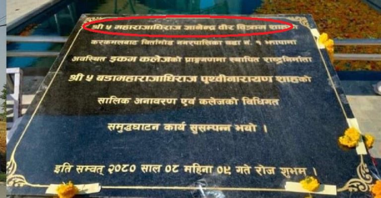 काठमाडौं, ११ मंसिर । बिर्तामोड–१ स्थित इकम कलेजमा पूर्वराजा ज्ञानेन्द्र शाहले अनवरण गरेको पृथ्वीनारायण शाहको सालिकमा ‘श्री ५’ लेखिएको शिलालेख हटाइएको छ ।