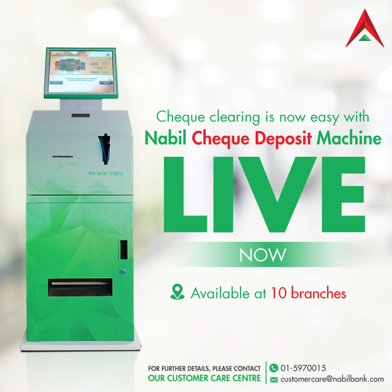 काठमाडौं, १९ मंसिर । नबिल बैंकले KIOSK मेसिन मार्फत चेक क्लियरिङ्ग गर्नसकिने सुविधाको प्रारम्भ गरेको छ । उक्त सुविधामार्फत outward clearing चेक अब ग्राहक स्वयंले KIOSK मार्फत सोझै सम्बन्धित नबिलको खातामा रकम जम्मा गर्न सक्नेछन् ।