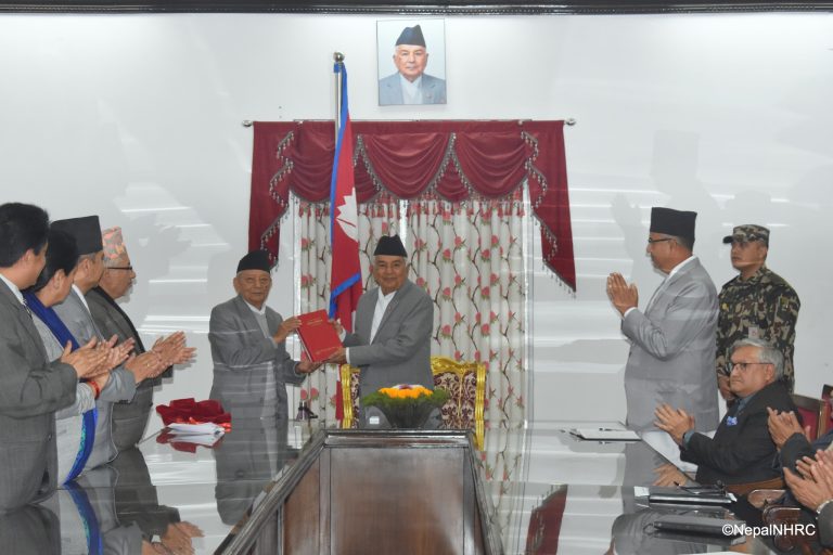 काठमाडौँ, २१ मङ्सिर । राष्ट्रिय मानव अधिकार आयोगले राष्ट्रपति रामचन्द्र पौडेलसमक्ष आर्थिक वर्ष २०७९र८० को वार्षिक प्रतिवेदन पेस गरेको छ । शीलतनिवासमा आज आयोजित समारोहमा आयोगका अध्यक्ष तपबहादुर मगरले राष्ट्रपतिसमक्ष आयोगको वार्षिक प्रतिवेदन पेस गरेका हुन् ।