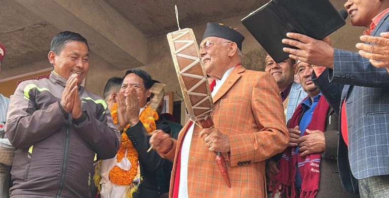 मेलम्ची पुगेका ओलीलाई सिन्धुवासीले दिए ढ्यांग्रो र डम्फु उपहार