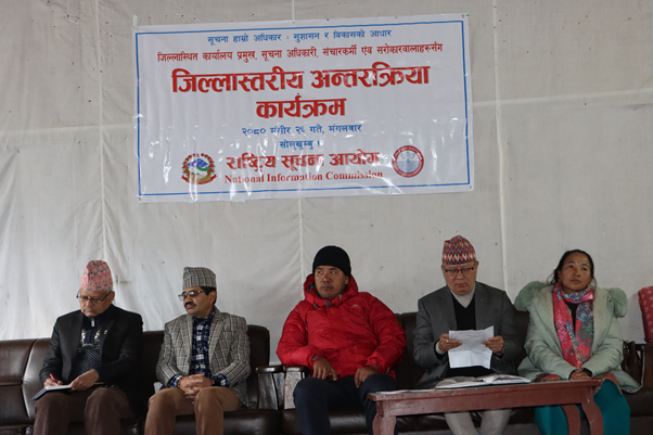 सोलु दूधकुण्ड नगरपालिकाका प्रमुख नाम्गेल जाङ्बु शेर्पाले लोकतन्त्रको सबल पक्षमध्ये सूचनाको हक पनि भएकाले नागरिक सुसूचित हुनुपर्ने बताए । “कार्यालयहरूले सूचना आदानप्रदान गर्दा गोपनीयताको हकको पनि ख्याल गर्नुपर्छ”, उनले भने । सरकारी सूचना प्राप्त गर्न पाउनु नागरिकको अधिकार भए पनि प्राप्त सूचनाको दुरुपयोग गर्न भने नहुने उनको भनाइ थियो ।