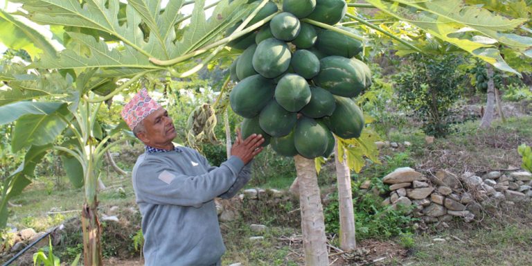 मन्थली (रामेछाप), ६ पुस । रामेछाप जिल्लामा पहिलो पटक व्यावसायिक अनारखेती गरेर ‘अनार बाजे’को नामले चिनिएका हिरालाल आचार्यले मेवा बेचेर मासिक एक लाख ५० हजार आम्दानी गर्छन् ।
