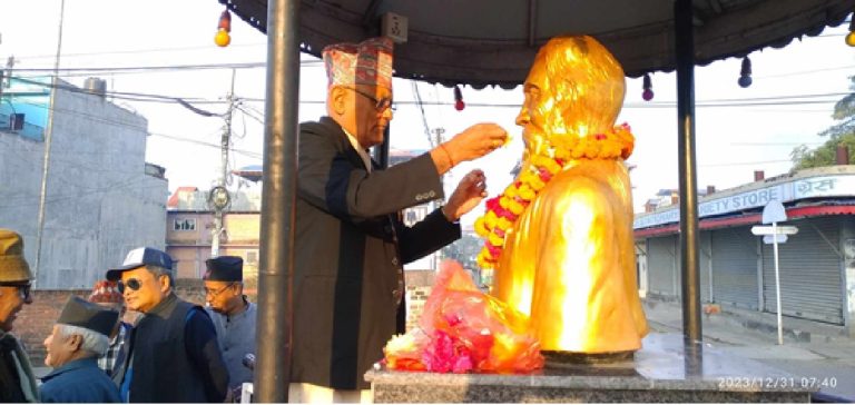 काठमाडौं, १५ पुस । कविशिरोमणि लेखनाथ पौड्यालको १४०औँ जन्मजयन्तीका अवसरमा धरान उपमहानगरपालिका–१६ स्थित लेखनाथ चोकमा रहेको कविशिरोमणि पौड्यालको शालिकमा माल्यार्पण गरेर कविवरको जन्मजयन्ती मनाइएको छ ।