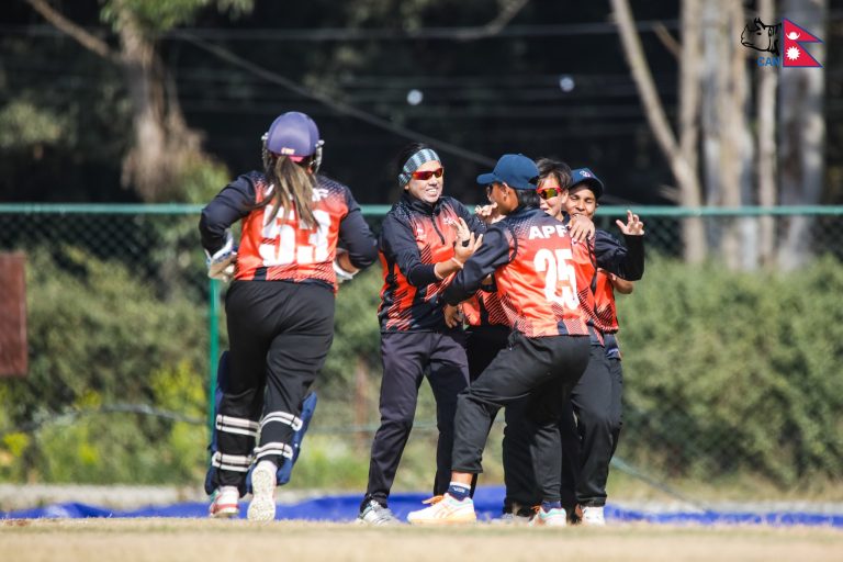 बलिङतर्फ एपीएफकी सीता राना मगर र करुणा भण्डारीले समान १ विकेट लिइन् । यसअघि त्रिवि क्रिकेट मैदानमा टस जितेर सुरुवातमा ब्याटिङ गरेको एपीएफले निर्धारित २० ओभरमा ७ विकेट गुमाएर ११४ रन जोडेको थियो ।
