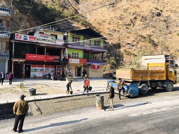 शर्मा युनाइटेडका इन्जिनियर प्रशान्त तिमिल्सिनाले करिब छ किलोमिटर दूरीमा सवबेस र बेस राख्ने काम सकिएको बताए । “मौसमले साथ दियो भने छदेखि आठ किलोमिटर दूरीसम्मको सडक यसपालि नै कालोपत्र गर्नका लागि मजदुर र उपकरण परिचालन गरी तयारी थालेका छौँ”, उनले भने ।
