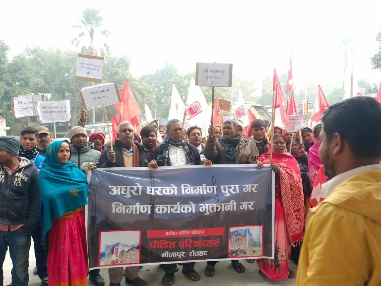 काठमाडौं, २२ पुष । रौतहटको मौलापुर–पतौराका पीडित परिवारले अधुरो घरको निर्माण कार्य पूरा गर्न र निर्माण कार्यको भुक्तानी माग गर्दै आन्दोलन थालेका छन् ।