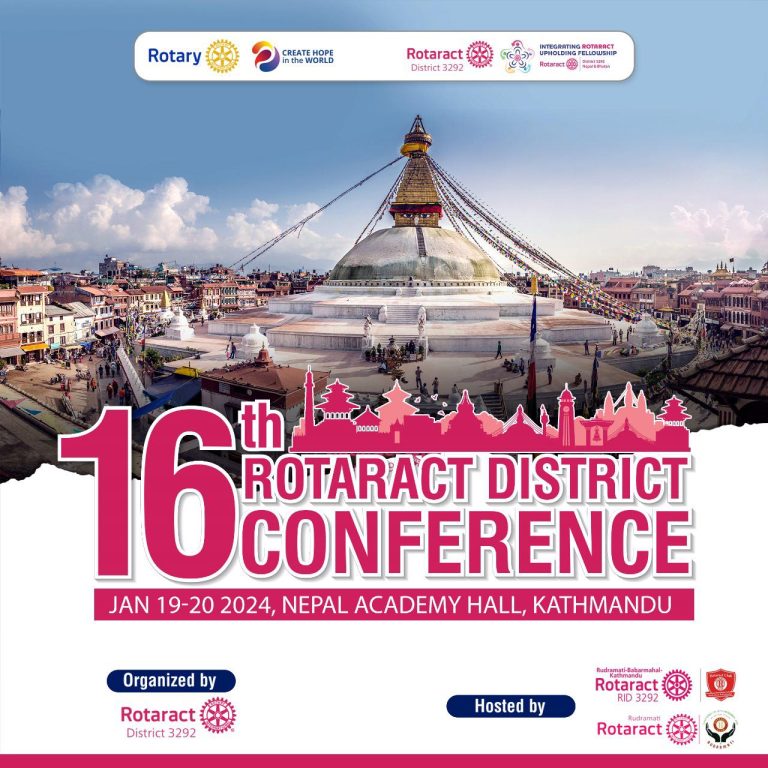 काठमाडौँ, २२ पुस । रोटर्याक्ट डिस्ट्रिक ३२९२ को १६ औँ राष्ट्रिय सम्मेलन अर्थात् १६ औँ रोटर्याक्ट डिस्ट्रिक कन्फ्रेस यही जनावरी १९ र २० गते काठमाडौंको कमलादी स्थित नेपाल प्रज्ञा प्रतिष्ठान हलमा आयोजना हुने भएको छ। उक्त कार्यक्रममा देश भरका १५०० भन्दा बढी युवाहरूको सहभागिता रहने छ। रोटर्याक्ट डिस्ट्रिक ३२९२ को आयोजनामा हुन लागेको यस कार्यक्रमलाई रोटर्याक्ट क्लब अफ रुद्रमती-बबरमहल-काठमाडौं र रोटर्याक्ट क्लब अफ रुद्रमतीले होस्ट गरेका छन्।