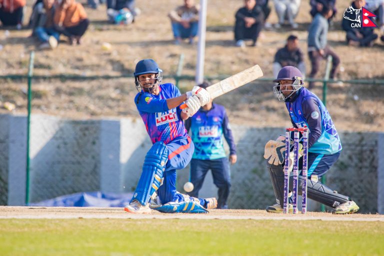उनलाई अर्का ब्याटर सुजन थपलियाले ३० रन बनाएर साथ दिईरहेका छन् । सुजनले पुलिसविरुद्धको खेलमा शतकीय पारी खेलेका थिए ।
