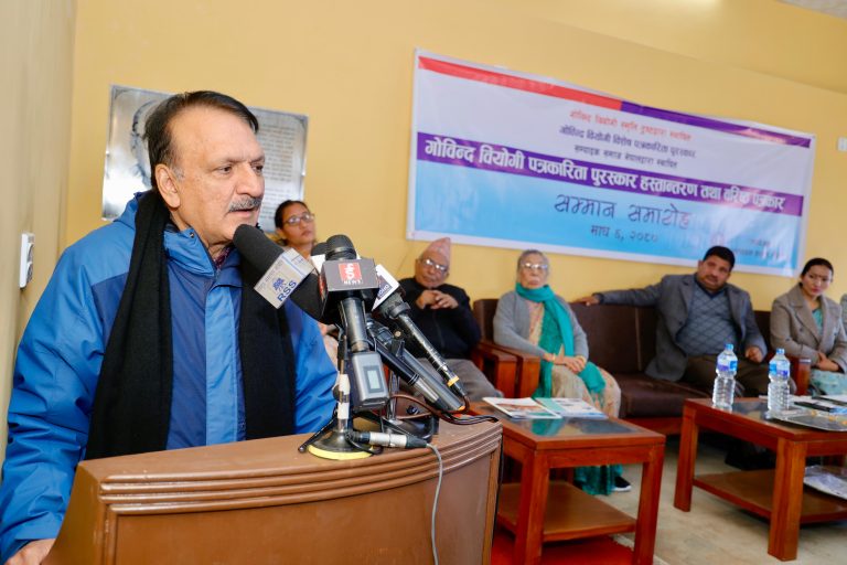 काठमाडौं, ६ माघ । अर्थमन्त्री डा.प्रकाशशरण महतले देशको आर्थिक अवस्थाले मात्र पत्रकारिता समस्यामा नपरेको स्पष्ट पारेका छन् । गोविन्द वियोगी स्मृति ट्रष्टद्वारा स्थापित गोविन्द वियोगी पत्रकारिता पुरस्कार हस्तान्तरण तथा वरिष्ठ पत्रकार सम्मान समारोहलाई सम्बोधन गर्दै मन्त्री डा. महतले पत्रकारिता समस्यामा पर्नुको मूल कारण सामाजिक सञ्जाल भएको बताए ।