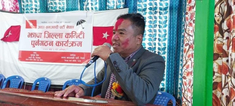 काठमाडौं, ७ माघ । जनता समाजवादी पार्टी (जसपा) नेपालको झापा जिल्ला समिति पुनर्गठन भएको छ । शनिबार बिर्तामोडमा आयोजित भेलाले दिपेनबाला राईको अध्यक्षतामा २९ सदस्यीय समिति पुनर्गठन गरेको हो ।