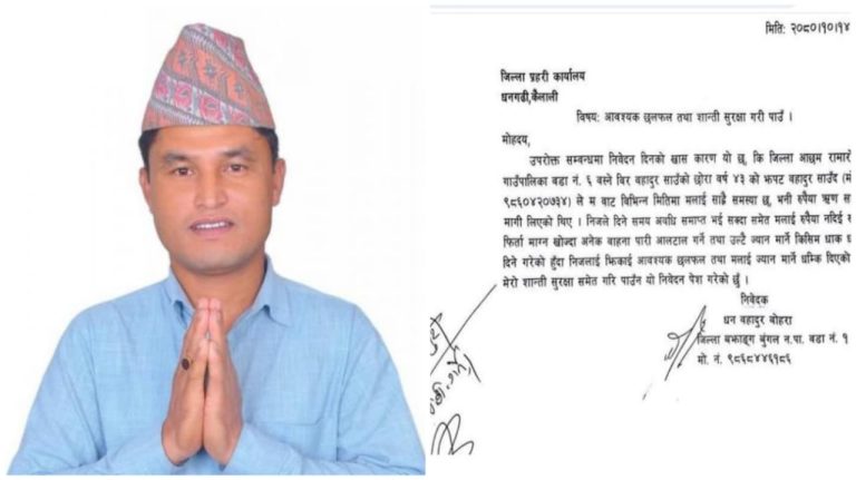‘ निजले दिने समय अवधि समाप्त भई सक्दा समेत मलाई रुपैया नदिई रुपैया फिर्ता माग्न खोज्दा अनेक वाहना पारी आलटाल गर्ने तथा उल्टै ज्यान मार्ने किसिमका धाक धम्कि दिने गरेको हुँदा निजलाई झिकाई आवश्यक छलफल तथा मलाई ज्यान मार्ने धम्कि दिएको हुँदा मेरो शान्ती सुरक्षा समेत गरि पाउँ’ बोहराले निवेदनमा भनेका छन् ।