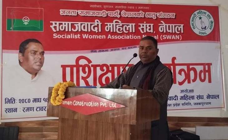 जसपा नेपालको भातृ संगठन समाजवादी महिला संघको मधेश प्रदेश समितिले मंगलबार जनकपुरधाममा आयोजना गरेको दुई दिवसीय प्रशिक्षणको उद्घाटन गर्दै अध्यक्ष यादवले शासक वर्गको मधेशप्रतिको विभेदकारी नीतिकै कारण मधेशको शिक्षा, स्वास्थ्य, भौतिक पूर्वाधार, रोजगार जस्ता क्षेत्र विकास हुन नसकेको बताएका हुन् ।