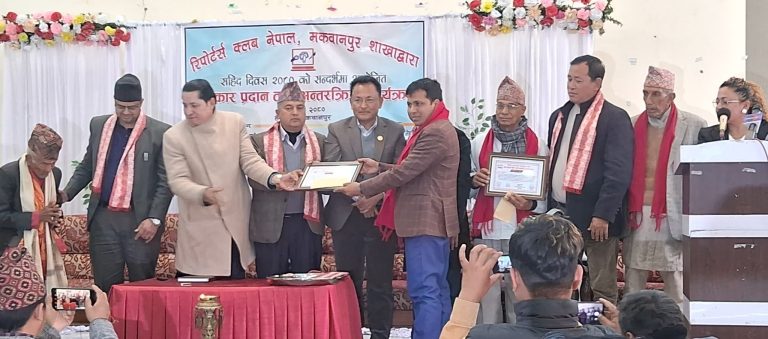 रिपोर्टर्स क्लव नेपाल, मकवानपुर शाखाले आज माघ १६ गते सहिद दिवसको अवसर पारेर आयोजना गरेको कार्यक्रममा बागमति प्रदेशका मुख्यमन्त्री सालिकराम जम्कट्टेल र बागमति प्रदेशकै आन्तरिक मामिला तथा कानुनमन्त्री गंगानारायण श्रेष्ठले जनही आठ हजार ८८८ रुपैयाँको पुरस्कार प्रदान गरिएको हो ।