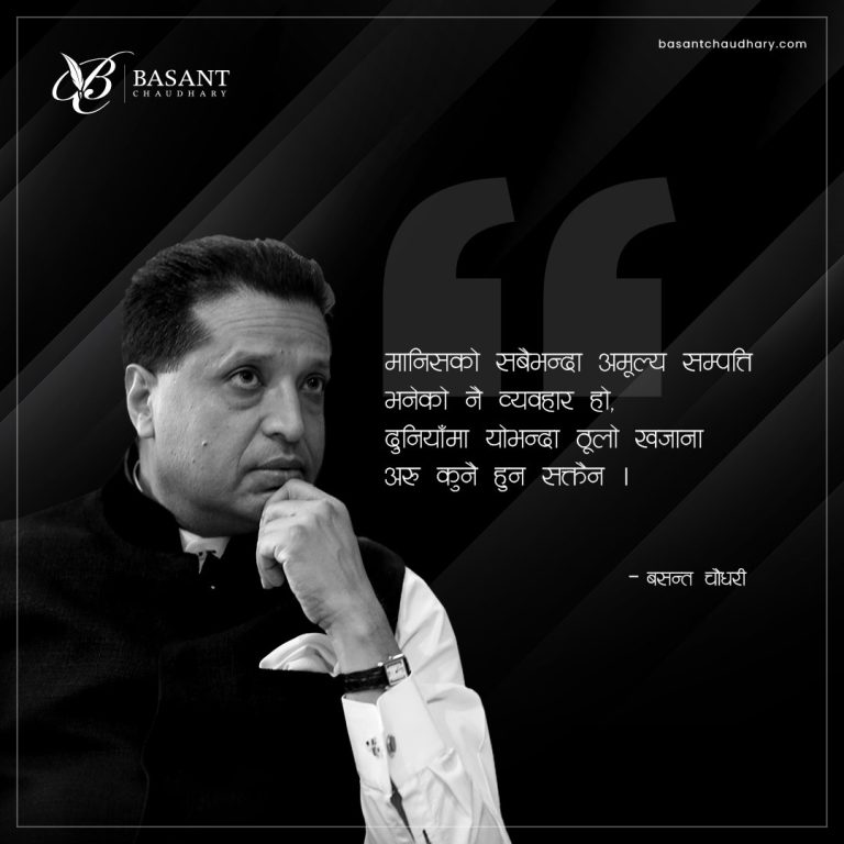 काठमाडौं, २३ माघ । चर्चित व्यवसायी तथा कवि वसन्त चौधरीले मानिसको सबैभन्दा अमूल्य सम्पत्ति भनेको उसको व्यवहार भएको उल्लेख गरेका छन् । मान्छेको व्यवहारभन्दा दुनियाँमा ठूलो खजाना अरू कुनै हुन नसक्ने उनको भनाई छ ।