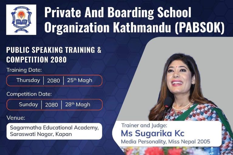 पब्लिक स्पिकिङ सम्बन्धी ट्रेनिङ आगामी माघ २५ गते सरस्वती नगर कपनस्थित सगरमाथा एजुकेसनल एकेडेमीको सभा हलमा हुनेछ ।