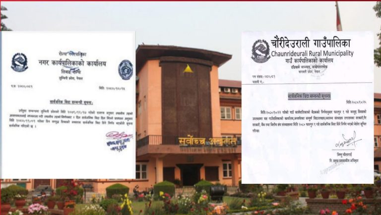 ‘गाउँ पालिकाको कार्यालय, अन्तर्गतका सम्पूर्ण विद्यालयहरू,स्वास्थ्य संस्थाहरूलगायतका सरकारी, गैरसरकारी, बैंक तथा वित्तीय संघ संस्थाहरूमा मिति २०८० फागुन १ गते सार्वजनिक बिदा दिने निर्णय भएको ब्यहोरा सूचित गरिन्छ’, सूचनामा भनिएको छ।