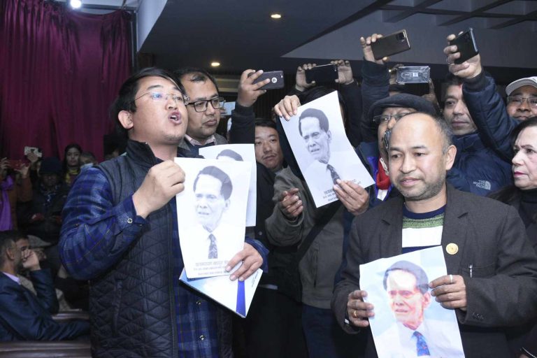 ‘अग्र अनुहार’ ल्याएर गलत इतिहासलाई पुष्टी गर्न खोज्नेहरुको विरुद्ध आफूहरु रहेको उनीहरुले बताए । उक्त पुस्तकमा नश्लीय अनुहारहरुलाई मात्रै राखेर पत्रकार महासंघले आफ्नो गलत इतिहासलाई स्थापित गर्न खोजेको उनीहरुको आरोप छ ।फोटो/भिडिओः मुकुन्द कालिकोटे/रिपोर्टर्स नेपाल