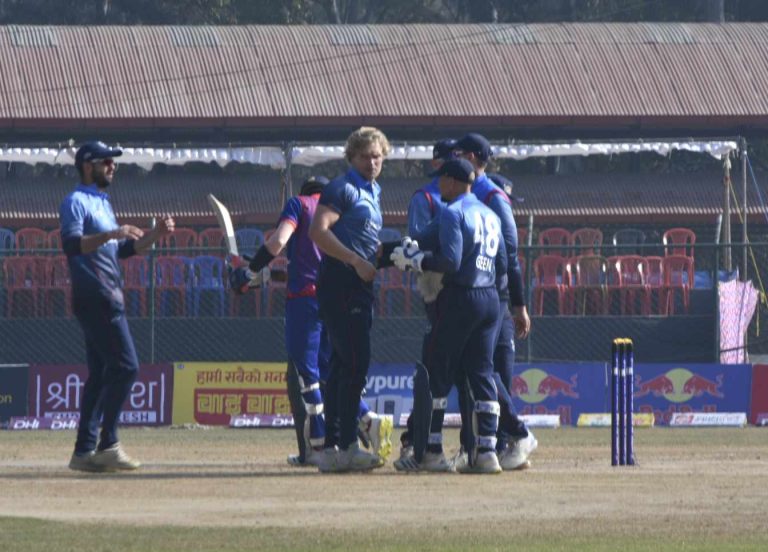 काठमाडौं,३ फागुन । आईसीसी विश्वकप लिग–२ त्रिकोणात्मक सिरिजअन्तर्गत नेपालले नामिबियाविरुद्ध १०० रन पूरा गरेको छ ।