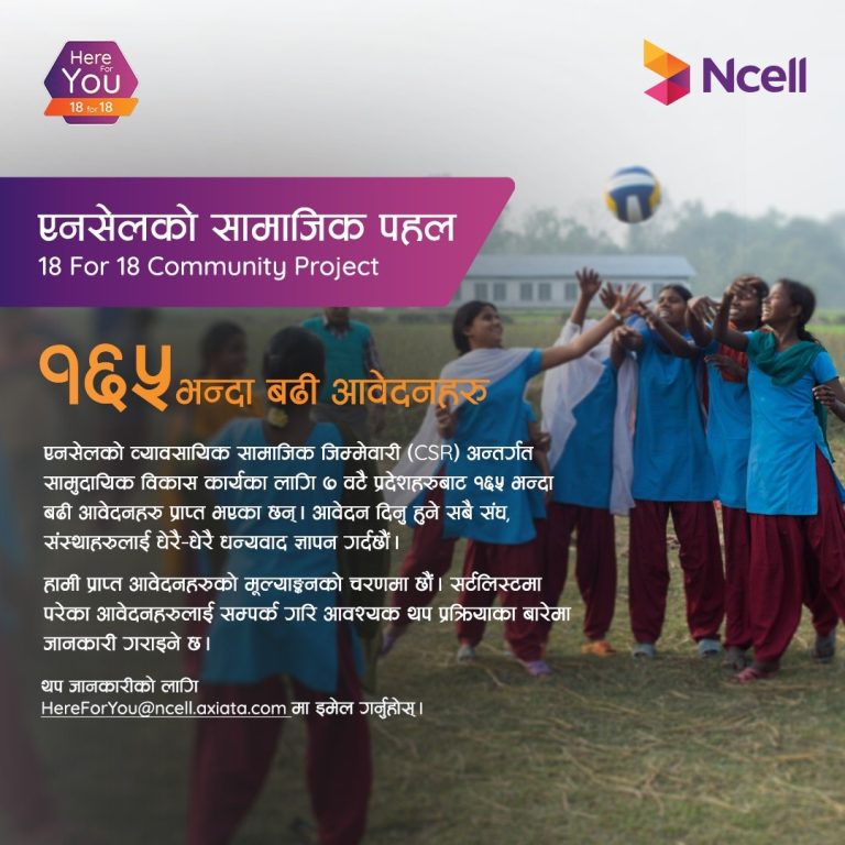 काठमाडौं, १० फागुन । एनसेलले आफ्नो व्यावसायिक सामाजिक जिम्मेवारी (सीएसआर) अन्तर्गत ‘एटीन फर एटीन’ अर्थात १८ का लागि १८ विकास कार्यका लागि देशका सातै प्रदेशबाट १६५ भन्दा बढी प्रस्तावहरु प्राप्त गरेको छ । कम्पनीले आफ्नो १८औं वार्षिकोत्सवको उपलक्ष्यमा समुदाय स्तरमा लागु हुने गरि यो कार्यक्रम संचालन गरेको हो ।