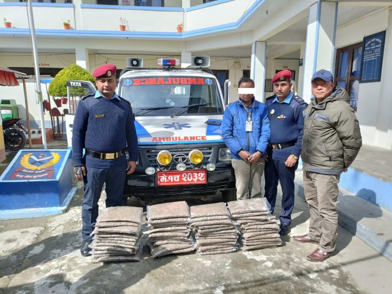 काठमाडौं, १३ फागुन । एम्बुलेन्सको प्रयोग गरी लागूऔषध गाँजा ओसारपसार गर्ने जयदेव चेललाई प्रहरीले पक्राउ गरेको छ । उनी धनकुटाको साँगुरीगढी गाउँपालिका–६ भेडेटारबाट शनिबार पक्राउ परेका हुन् ।