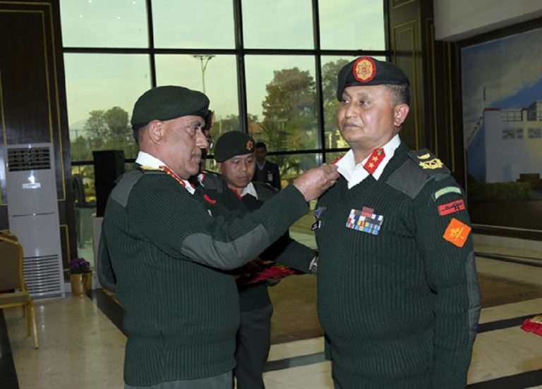 काठमाडौँ, १३ फागुन । प्रधानसेनापति प्रभुराम शर्माले उपरथीमा पदोन्नति भएका सुनिल श्रेष्ठ, अनुपजङ्ग थापा र प्रकाश देउजालाई आज जङ्गी अड्डामा आयोजित एक कार्यक्रममा दर्ज्यानीचिन्ह प्रदान गरेका छन् ।
