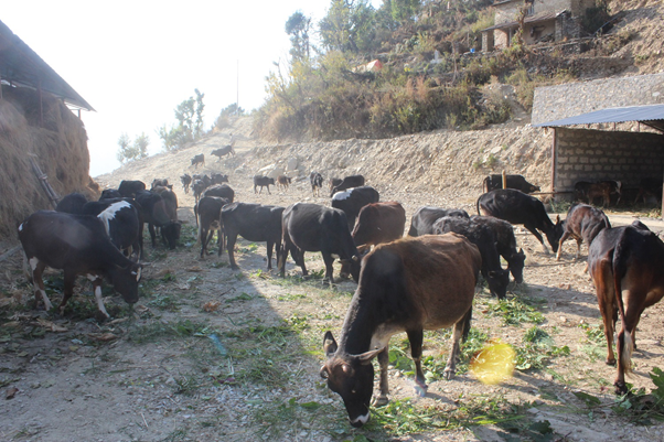 म्याग्दी, १४ फागुन । म्याग्दीको धवलागिरि गाउँपालिका–७ ताकमका इन्द्रलाल पौडेलका गोठमा २५ वर्षअघिसम्म ४२ वटा गाईगोरु थिए । “हिजोआज धार्मिक कार्यका लागि आवश्यक पर्ने गाईको दूध र गहुँत नपाइने अवस्था आयो”, उनले भने, “गाई देखिनै छाडे, गोरु पनि पाउन मुस्किल भयो ।”