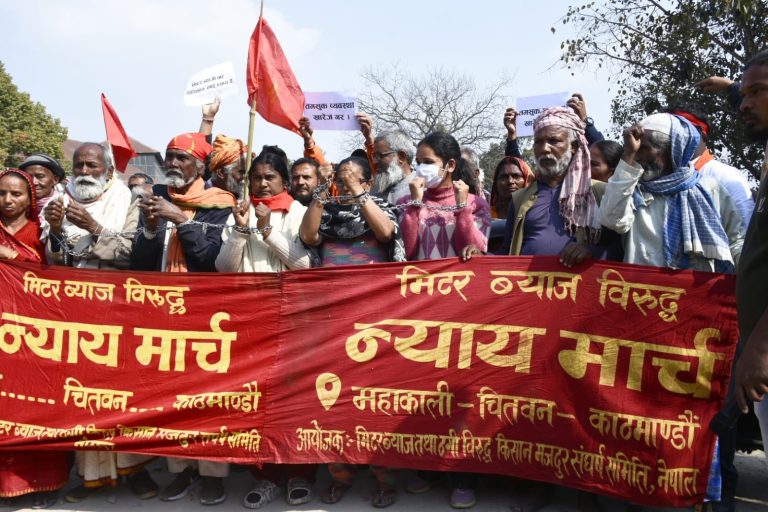 फर्जी लिखत, तमसुक, दृष्टिबन्धक, छिनुवा, चेक सम्पूर्णलाई अवैध घोषणा गर्नुपर्ने, साहुले जफत गरेका सम्पूर्ण सम्पत्ति फिर्ता गर्नुपर्ने र अधिकार सम्पन्न न्यायिक आयोग गठन गर्नुपर्ने मिटरब्याज पीडितहरुको माग छ । Photo By: Mukunda Kalikote/RN