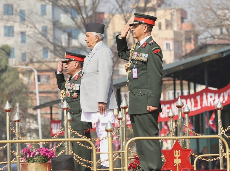 काठमाडौँ, २५ फागुन । राष्ट्रपति रामचन्द्र पौडेल महाशिवरात्रि तथा २६१औँ सेना दिवसका अवसरमा नेपाली सेनाद्वारा सैनिक मञ्च टुँडिखेलमा आज आयोजित विशेष समारोहमा सरिक भएका छन् । सो अवसरमा उनले त्यहाँस्थित सैनिक स्मारकमा पुष्पहार अर्पण गरी श्रद्धाञ्जली व्यक्त गर्नुका साथै नेपाली सेनाद्वारा अर्पण गरिएको सलामी ग्रहण गरे ।