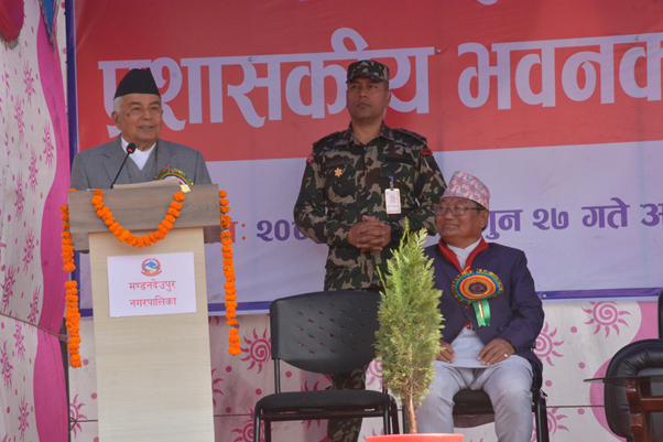 मण्डनदेउपुर नगरपालिकाको सातौँ स्थापना दिवस तथा नवनिर्मित प्रशासकीय भवनको आज उद्घाटन गर्दै उनले संविधानको भावना तथा सङ्घीयताको मर्मअनुरुप हुनेगरी राज्यबाट प्रवाह हुने सेवा तथा विकास निर्माणसम्बन्धी कामलाई नतिजामुखी र नागरिकले अनुभूत गर्न सक्नेगरी सम्पादन गर्न र सुशासन प्रत्याभूत गर्न स्थानीय निकाय दत्तचित्त हुनुपर्नेमा जोड दिए । उनले विकास, पूर्वाधार, कृषि, शिक्षा, सडक, खानेपानी, बिजुलीसहित जनताका आधारभूत आवश्यकता पूरा गर्नुपर्ने बताए ।