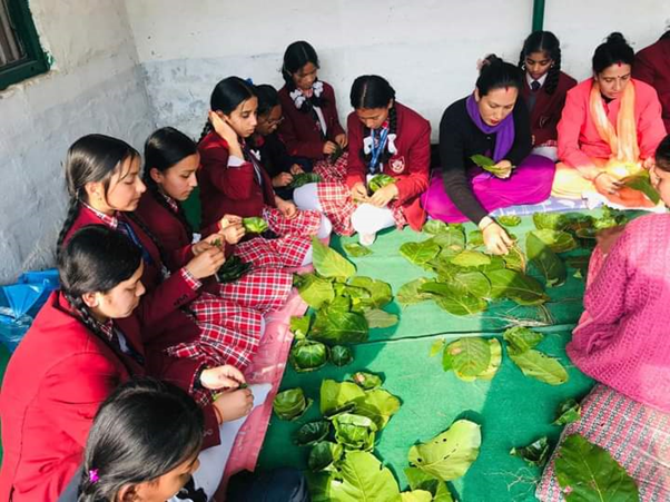 शिक्षिकाहरुको बीचमा बसेर पात गाँस्दै गरेकी कक्षा १० मा अध्ययनरत पूजा सापकोटा र कक्षा ९ कि रोशनी जिसीले पूजाआजा र अनुष्ठानमा चाहिने दुनाटपरी गाँस्न सक्ने भएको बताए ।
