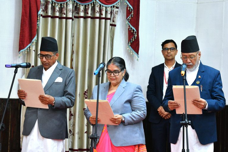 राष्ट्रपति कार्यालय आज अपराह्न आयोजित विशेष समारोहमा राष्ट्रपति पौडेलले मधेस प्रदेशका प्रमुख सुमित्रा भण्डारी, गण्डकी प्रदेशका प्रमुख डिल्लीराज भट्ट र सुदूरपश्चिम प्रदेशका प्रमुख नजिर मियाँलाई पद तथा गोपनीयताको शपथ गराएका हुन् ।