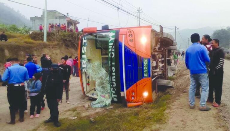 पोखराबाट काठमाडौं जाँदै गरेको बा १ प ११३९ नंम्बर को पर्यटक बस सडकको दायाँ साइडमा पल्टिँदा छ जना घाइते भएका हुन् । जिल्ला प्रहरी कार्यालय तनहुँका अनुसार दुर्घटनामा बसमा २६ सवार रहेका थिए ।