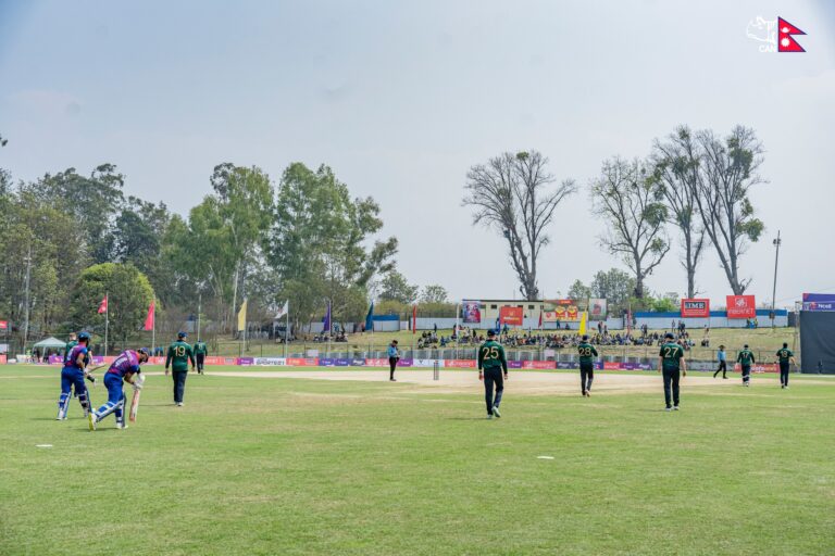 टस जितेर पहिले ब्याटिङ गरिरहेको नेपालले ३ विकेटको क्षतिमा एक सय रन पुरा गरेको छ । ताजा अवस्थामा नेपालले १२ ओभरको खेल चलिरहँदा ३ विकेट गुमाएर १०३ रन जोडेको छ । नेपालको क्रिजमा कप्तान रोहित पौडेल र गुल्सन झा रहेका छन् ।