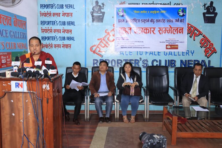 काठमाडौं, १३ चैत । धर्म टेलिभिजन र बुद्धिस्ट टिचिङ एण्ड मेडिटेसन सेन्टरको संयुक्त महाअभियान धर्म आइडल क्याम्पेनले नेपालमा ‘प्रथम अन्तर्राष्ट्रिय ड्युड्ने बौद्ध समारोह–२०२४’ आयोजना गरेको छ । आज (मंगलबार) रिपोर्टर्स क्लब नेपालमा पत्रकार सम्मेलन गरी कार्यक्रमबारे जानकारी गराइएको हो ।