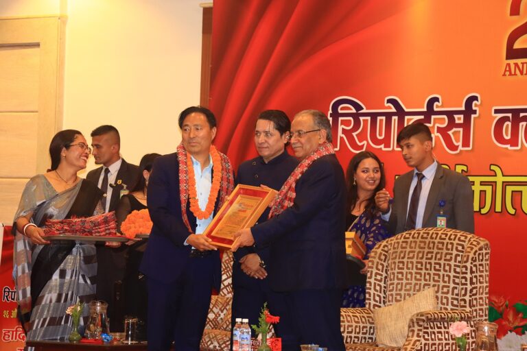 काठमाडौं, १८ चैत । शहरी विकास मन्त्री धनबहादुर बुढा सम्मानित भएका छन् । रिपोर्टर्स क्लब नेपालको २६औं वार्षिकोत्सवको अवसरमा आयोजित समारोहमा मन्त्री बुढालाई प्रधानमन्त्री पुष्पकमल दाहाल ‘प्रचण्ड’ र क्लबका सभापति ऋषिराज धमलाले संयुक्त रुपमा सम्मान गरेका हुन् । मन्त्री बुढाले राजनीतिमार्फत मुलुकको आर्थिक, सामाजिक, राजनीतिक, सांस्कृति विकासमा पुर्याएको योगदानको कदर गर्दै क्लबले आफ्नो वार्षिकोत्सवको अवसरमा सम्मान प्रदान गरेको हो ।