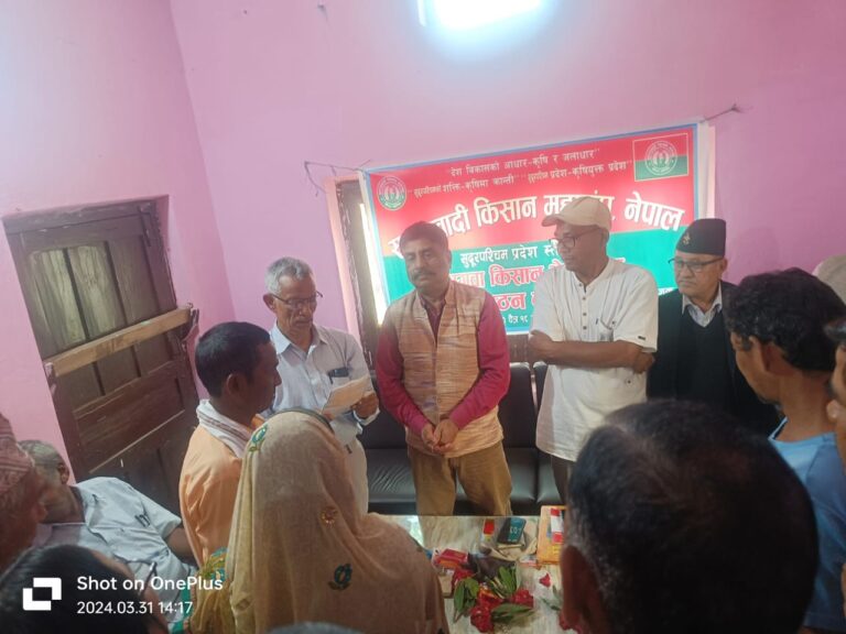 काठमाडौं, १८ चैत । जनता समाजवादी पार्टी (जसपा) नेपालनिकट समाजवादी किसान महासंघ सुदूरपश्चिम प्रदेश समिति गठन भएको छ । कैलालीको धनगढीमा आइतबार आयोजित भेलाले काजिराम महतोको अध्यक्षतामा १५ सदस्यीय समिति गठन गरेको हो ।