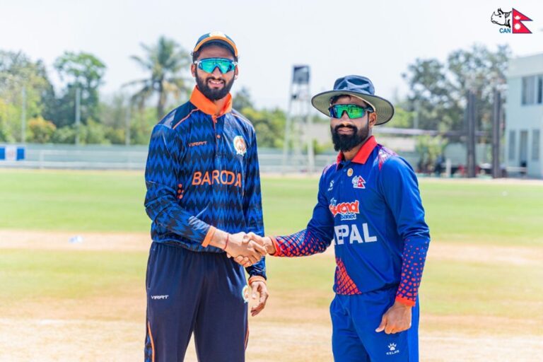 काठमाडौं । एसएमएस फ्रेन्डसिप कप अन्तर्गत बरोडा क्रिकेट एसोसिएसनविरुद्धको अन्तिम खेलमा नेपालले पहिले फिल्डिङ गर्ने भएको छ।