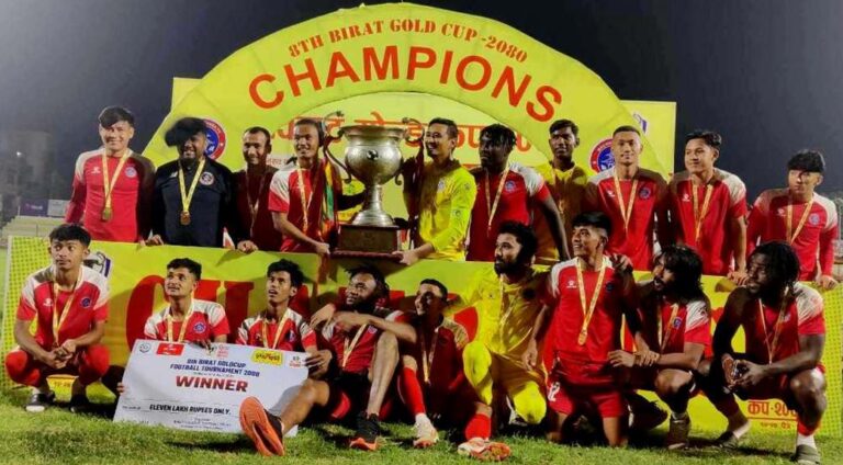 विराटनगर, चैत २५ । घरेलु टिम सांग्रिला मोरङ एफएलाई पराजित गर्दै मच्छिन्द्र फुटबल क्लबले विराट गोल्ड कपको उपाधी जितेको छ । शनिवार विराटनगरस्थित शहिद रंगशालामा भएको फाइनल खेलमा मच्छिन्द्र फुटबल क्लबले सांग्रिला मोरङ फुटबल एशोसिएशनलाई २-० ले पराजित गर्दै विराट गोल्ड कप जितेको हो । यो जित सँगै मच्छिन्द्र फुटबल क्लबले ११ लाख नगद सहित ट्रफी उचालेको हो । मच्छिन्द्र फुटबल क्लबले यो सिजनमा केपी ओली ट्रफी र बाग्मती ट्रफी सँगै आठौं विराट गोल्ड कप जितेको हो ।