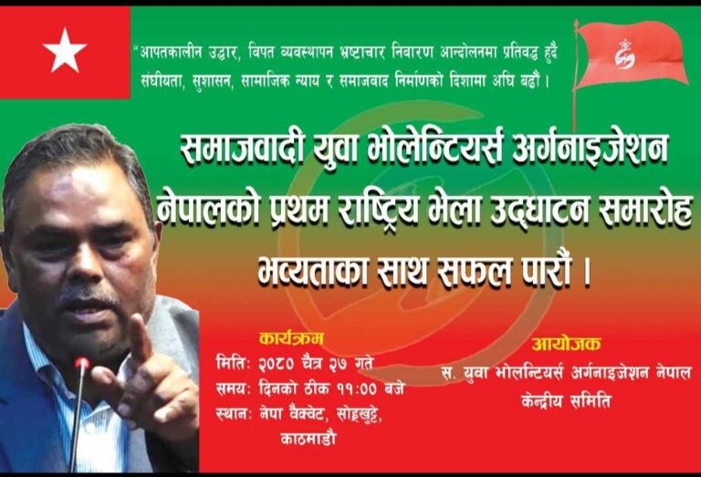 काठमाडौं, २६ चैत । जनता समाजवादी पार्टी (जसपा) नेपालनिकट समाजवादी युवा भोलेन्टियर्स अर्गनाइजेसनको राष्ट्रिय भेला हुने भएको छ । खुसीबुस्थित नेपाः व्याङक्वेटमा भोलि (मङ्गलबार) आयोजना गर्न लागेको भेलाबाट भोलेन्टियर्स अर्गनाइजेसनको केन्द्रीय समिति गठन गरिने छ ।