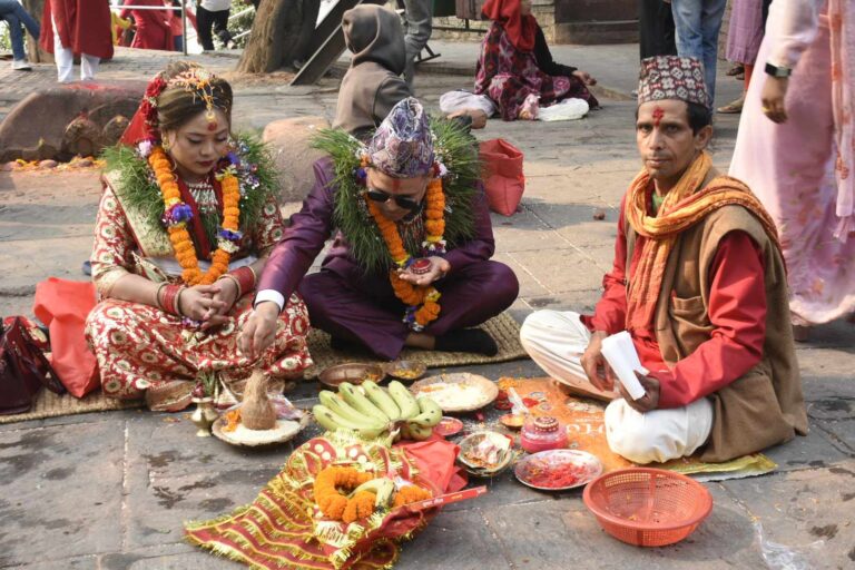काठमाडौं, १ बैशाख । आज नयाँ वर्ष २०८१ । नयाँ वर्षको अवसर पारेर काठमाडौंमा एक जोडीले वैवाहिक जीवनको सुरुवात गरेका छन् । तस्विर : मुकुन्द कालिकोटे, रिपोर्टर्स नेपाल डटकम