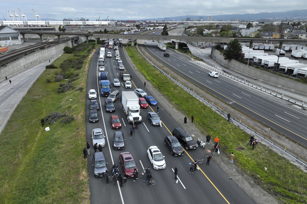 प्रदर्शनकारीहरूले गोल्डेन गेट ब्रिजमा सबै सवारी साधन, पैदल यात्री र बाइक ट्राफिकहरू बन्द गरेको र ओकल्यान्डको अन्तरराज्यीय ८८० मा सिमेन्टले भरिएका ५५ ग्यालेन ड्रममा बाँधेर राखेकाले सानफ्रान्सिस्को खाडी क्षेत्रमा ट्राफिक घन्टौँसम्म रोकिएको थियो ।