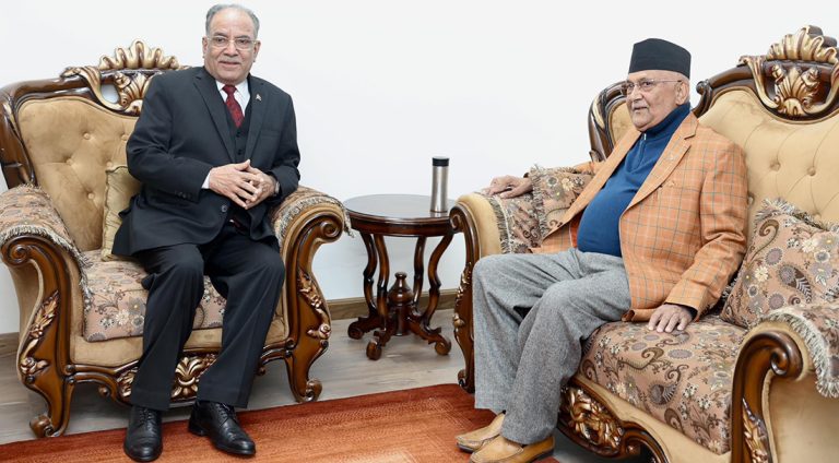 काठमाडौं, ६ वैशाख । प्रधानमन्त्री पुष्पकमल दाहाल ‘प्रचण्ड’ र नेकपा (एमाले) का अध्यक्ष केपी शर्मा ओलीबीच भेटवार्ता भएको छ । इलामबाट आज फर्किएका ओली एयरपोर्टबाट सिधै सिंहदरबार आएका थिए ।