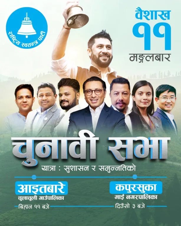 रास्वपाको ती दुई ठूला चुनावी सभामा सभापति लामिछाने, उपसभापति वाग्ले, महामन्त्री मुकुल ढकाल, युवा नेता तथा मन्त्री विराजभक्त श्रेष्ठ, नेतृ तथा सांसद सोविता गौतम, प्रमुख सचेतक सन्तोष परियारलगायतले सम्बोधन गर्ने भनिएको छ । भोलिको पहिलो चुनावी सभा आइतबारेमा विहान ११ बजे र दोस्रो सभा दिउँसो ३ बजे कपुरसुकामा हुने जनाईएको छ ।