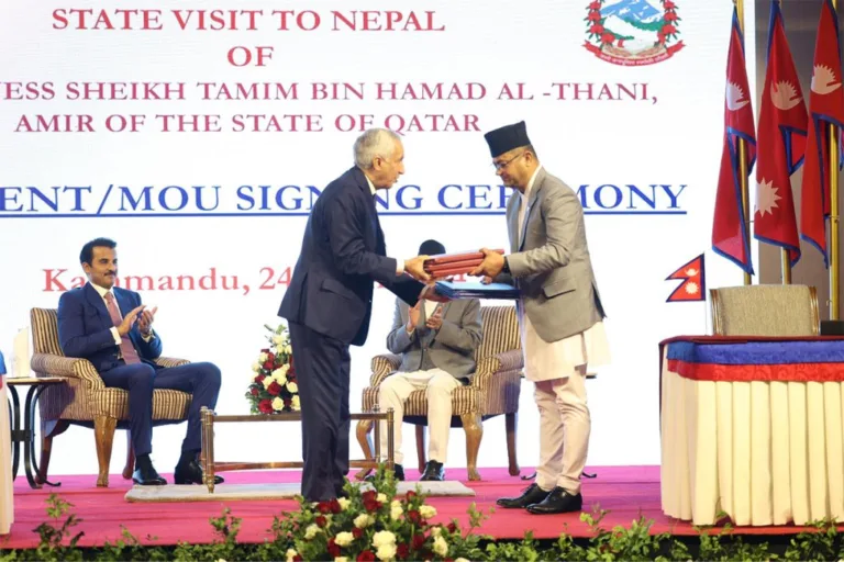 काठमाडौं,१२ वैशाख । कतार र नेपालबीच द्विपक्षीय समझदारीमा हस्ताक्षर भएको छ । होटेल सोल्टीमा सुरू भएको नेपाल र कतारका प्रतिनिधि मण्डलस्तरीय बैठकमा ८ विषयमा समझदारीपत्रमा हस्ताक्षर भएको हो ।