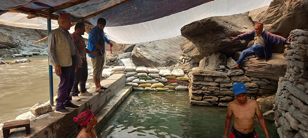 गलेश्वर (म्याग्दी), १२ वैशाख । म्याग्दीको रघुगङ्गा गाउँपालिका–४, दर्मिजामा रहेका प्राकृतिक तातोपानीका कुण्ड वर्षौंदेखि त्रिपालको ओतमुनि रहेको छ । तातोपानी कुण्डमा डुबेर उपचार गराउने बिरामीमा त्यहाँसम्म जान बाटो र कुण्डमा भौतिक पूर्वाधार निर्माण भए पनि कुण्डमा जस्तापाताको छाना नहाल्दा त्रिपालको ओतमुनि बसेर बिरामीहरु तातोपानी कुण्डमा डुब्न वा स्नान गर्न बाध्य छन् ।